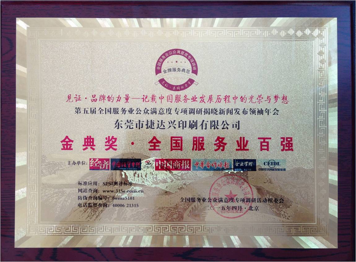 2015年4月捷达兴荣获“全国服务业百强企业”,总经理朱发富应邀于北京人民大会堂获授颁奖。